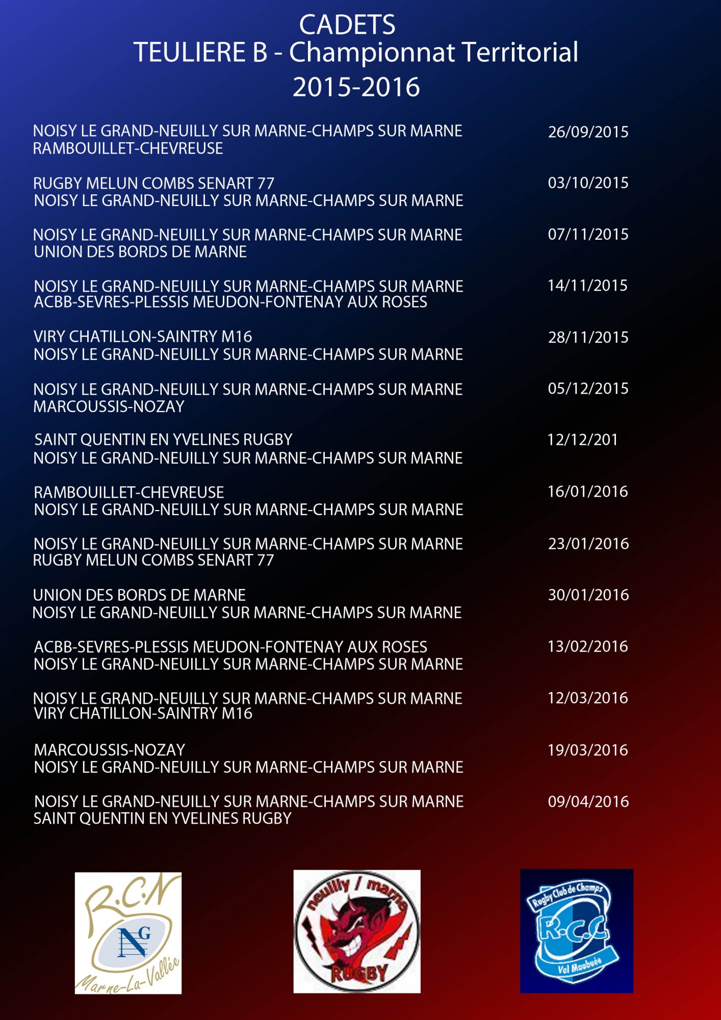 CALENDRIER CADETS 2015-2016